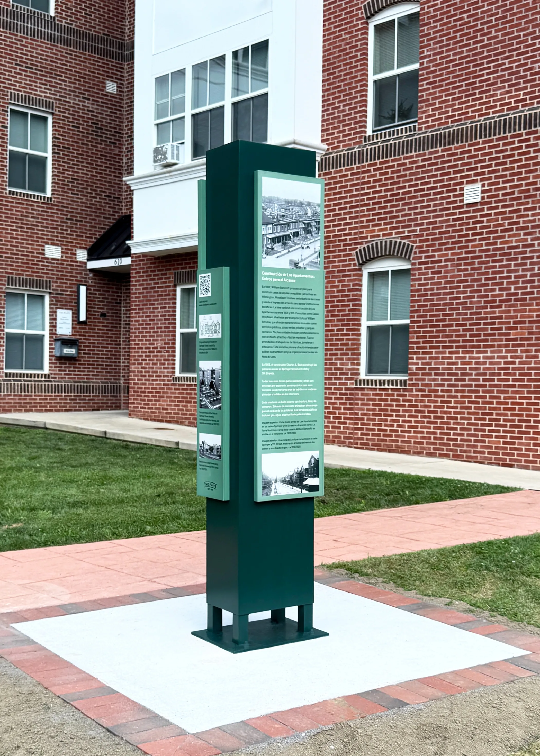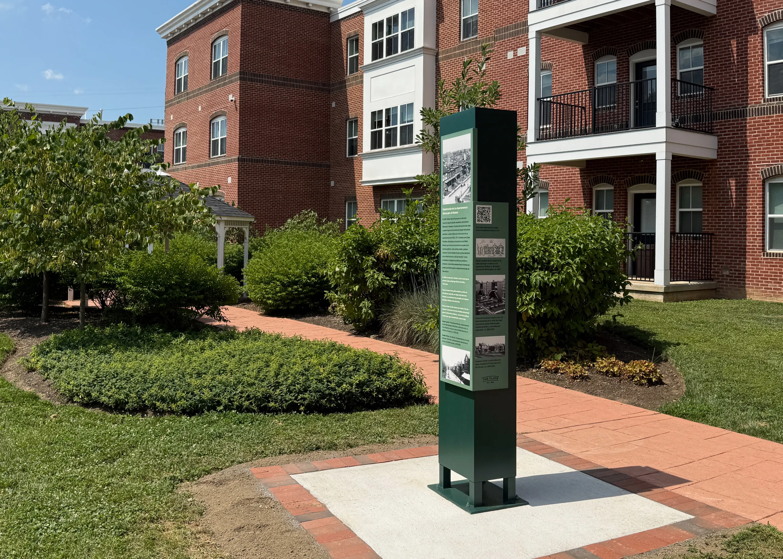 A series of interpretive signage totems for a historic community development in Wilmington, Delaware, founded by William Poole Bancroft in 1902. The project presents the history of Bancroft and the Woodlawn Trustees, along with the architectural and landscape history of the Flats neighborhood.