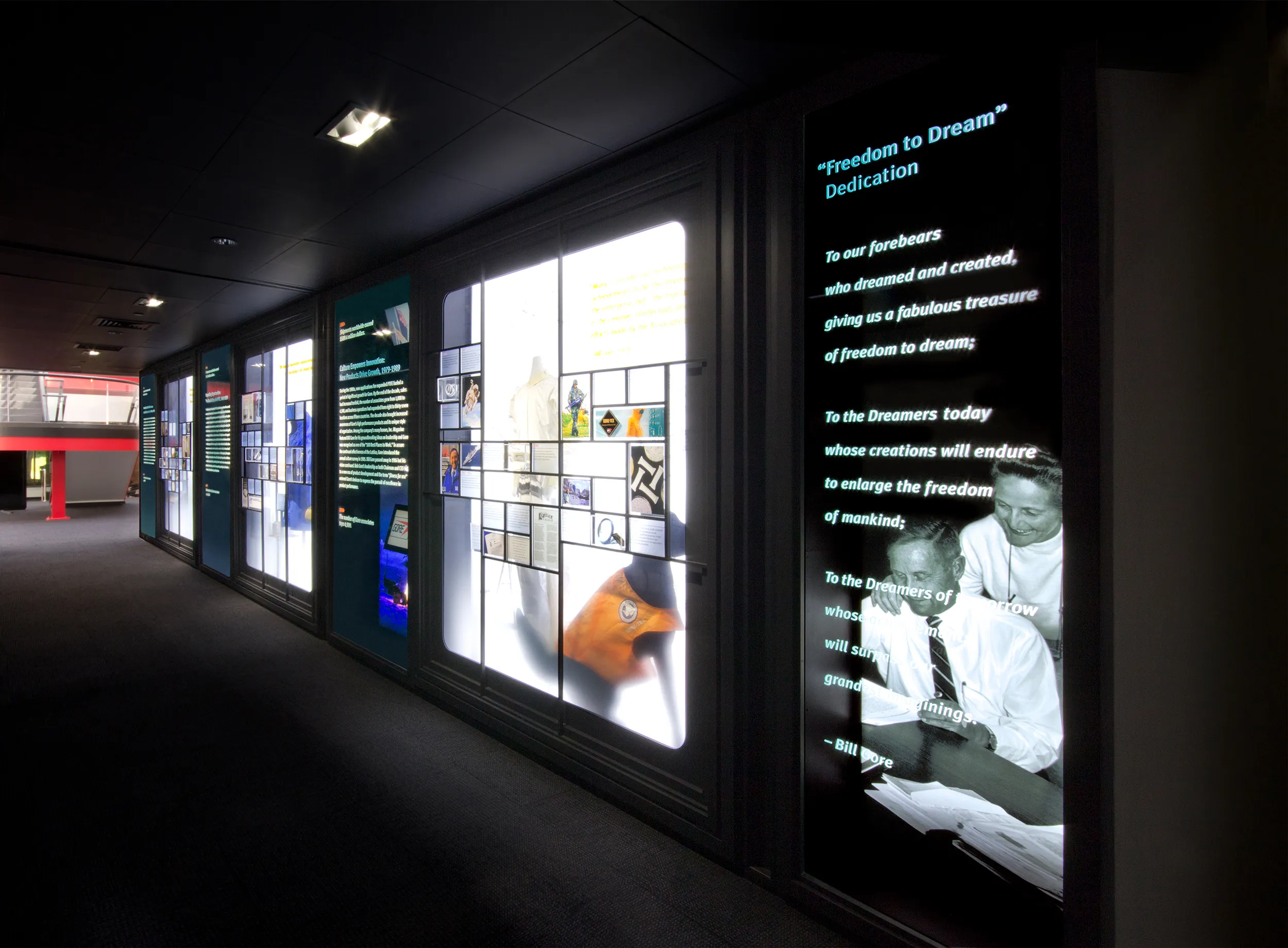 Pivot door–faced display cabinets anchor each decade of the exhibit. Each door features a six-foot-wide digitally etched gradient glass panel, shifting from frosted to clear, subtly separating the objects inside from the floating timeline attached to the door. Chosen for its strength and subtlety, the pivot door integrates seamlessly into the structure, supports the weight of the timeline and glass panel, and allows smooth front access to the cabinet interior where rear access is not available.